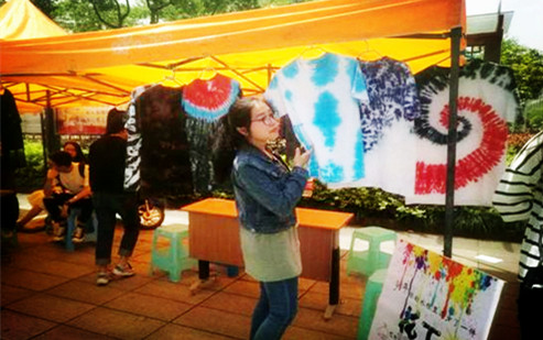 活动当天,两个班级的同学分组搭建10余个帐篷售卖各自风格各异的T恤,学生以各种不同形式不同工艺制作出不同的T恤,有印花工艺,也有扎染工艺,还有各种拼贴,剪切,将今年各种流行元素运用到T恤上,如今年大热的渔网袜。运用各种营销手法,将理论和实践相结合,提高了学生们的社会实践能力,响应学院全面提高应用技术型人才培养的号召。
