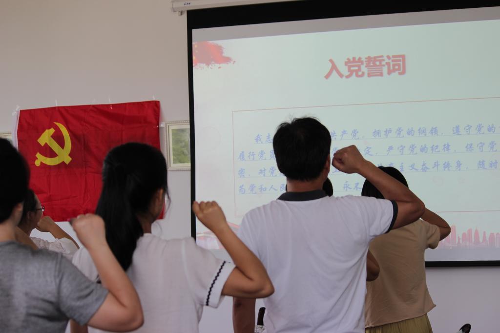 党课正式开始前,在鲜红的党旗下,由学院副院长石旭明带领着全体教职工党员,举起右手、握紧拳头,以庄重的仪式重温入党誓词。