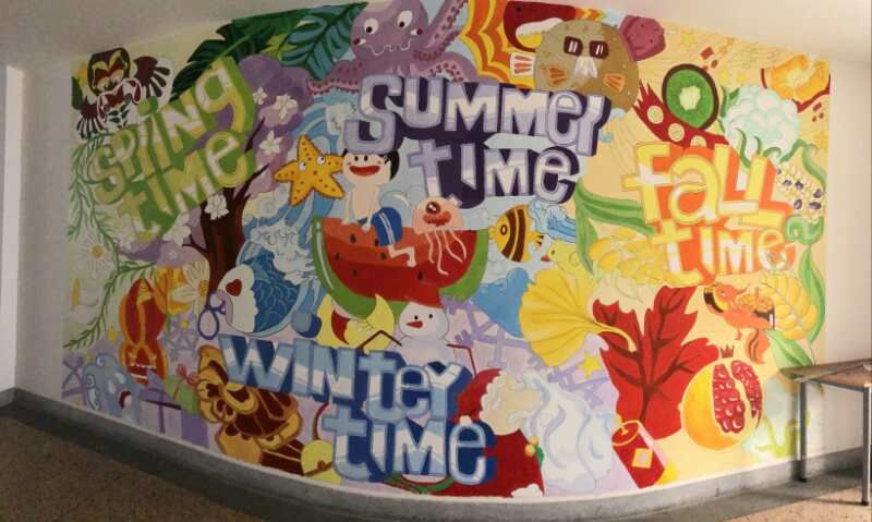 《四季时光》由宋慧莹等同学共同完成,他们在作品中融入了四季最具有代表性的元素,四季的英文单词穿插其间,应用的色彩更是多种多样,让人眼前一亮的同时也从侧面反映了元培校园生活的丰富多彩。