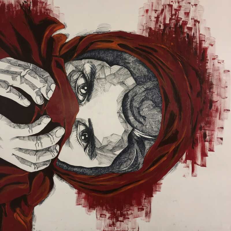 该作品由叶姣静同学绘制,整幅墙绘以黑为细节刻画,用大面积的红色进行上色,给人带来强烈的视觉冲击感。细节处用极细到粗的马克笔进行刻画,在眼睛处更加仔细传神的刻画。人物眼神的坚定坚毅表现得淋漓尽致。