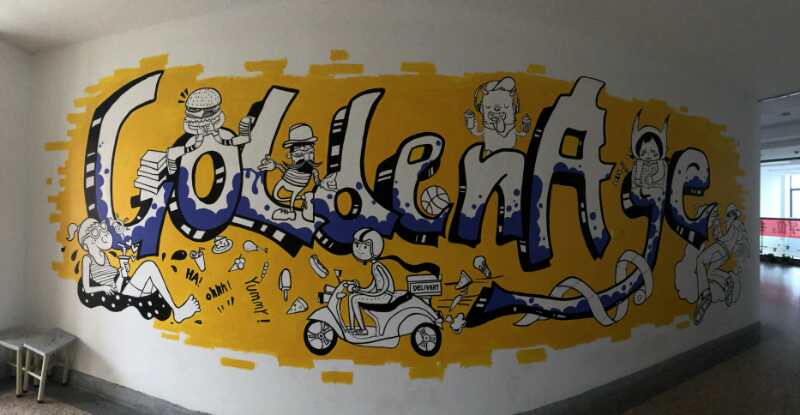 自墙绘开始,同学们便投入了十二万分的热情,将自己的绘画才能运用极致。当你走过画满墙绘的走廊时,映入眼帘的便是一幅名为《燃》的墙绘作品。