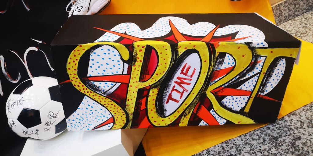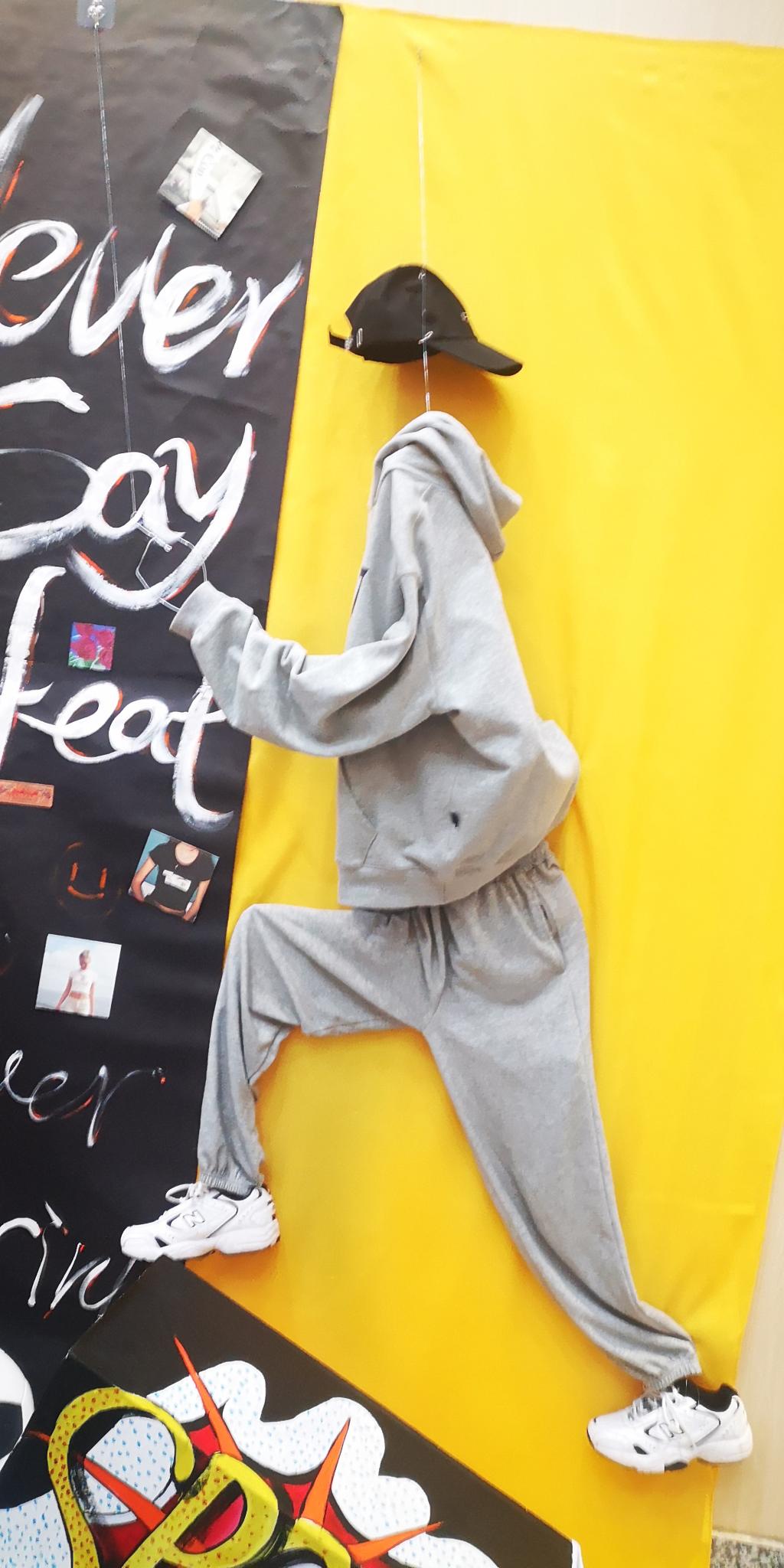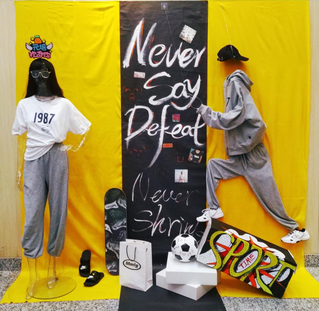运动装的主题是“Sports time—— 运动时刻”,在颜色上,运用黑色和黄色,对比强烈。运用足球和滑板等运动用品表现运动风格,特别是自己动手绘画制作的道具和墙上用铁丝拗成的奔跑的人也极致表达了运动的主题。墙面上的文字涂鸦,never say defeat永不言败,运动就是要持之以恒,永不言败。本次陈列设计致力于打造一种别致休闲运动的风格给人视觉上的巨大冲击,洒脱,热血,不刻意却又散发无穷魅力。