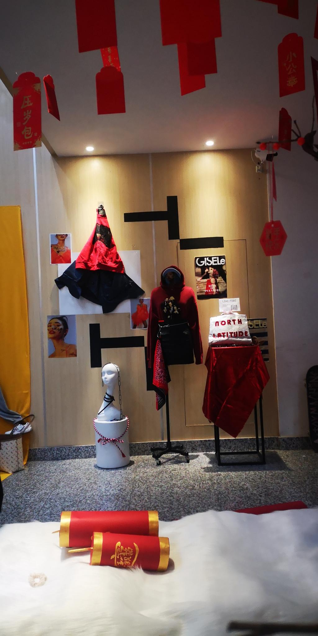 在童装区左右两侧展示的是高街女装。左陈列区以早春新款作搭配陈列,采取红白双色,上浅下深,利用银饰搭配,时尚大方。背景墙采用无彩色的黑,条状纸板与海报装饰,填充陈列区域上层的空间。其次配饰选择单品都为新年红,突出本次新品的主色调。陈列方式也选用稳定的三角形陈列法。右陈列区以青春暗黑风格陈列,延续红色为主色调,降低了白色的使用,增添了黑色的使用,配饰多采用黑色皮质包,及黑色链条,银色镭射包,凸显此块陈列服装风格。运用的陈列方法有递降的空间使用法,和三角构建织面陈列。与背景墙相呼应呈现出空间感。