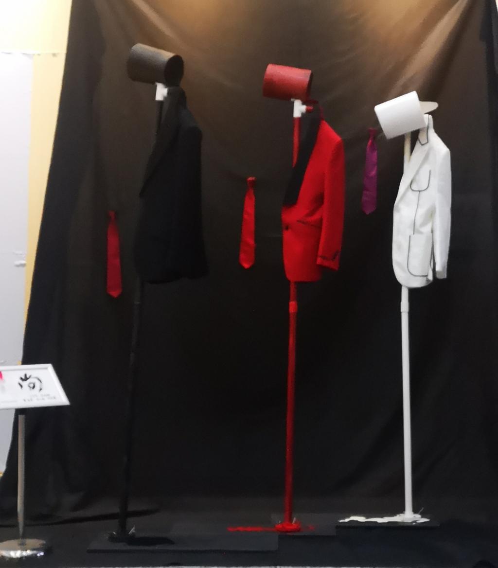 商务男装的陈列十分的耐人寻味,巧妙地应用道具营造出高级但有趣的氛围,以“尚”为主题,将红色、黑色、白色通过倾斜的漆桶里倒出油漆的动感瞬间来表现。同时在地面特意泼洒塑造的油漆滴下来的效果更是突出了此次陈列的创意。