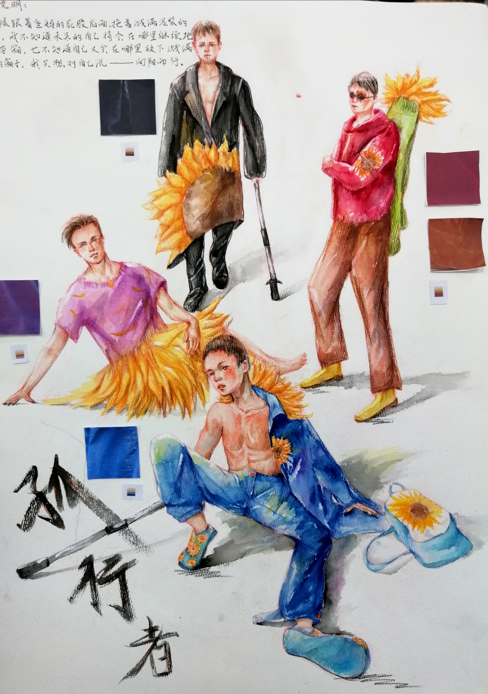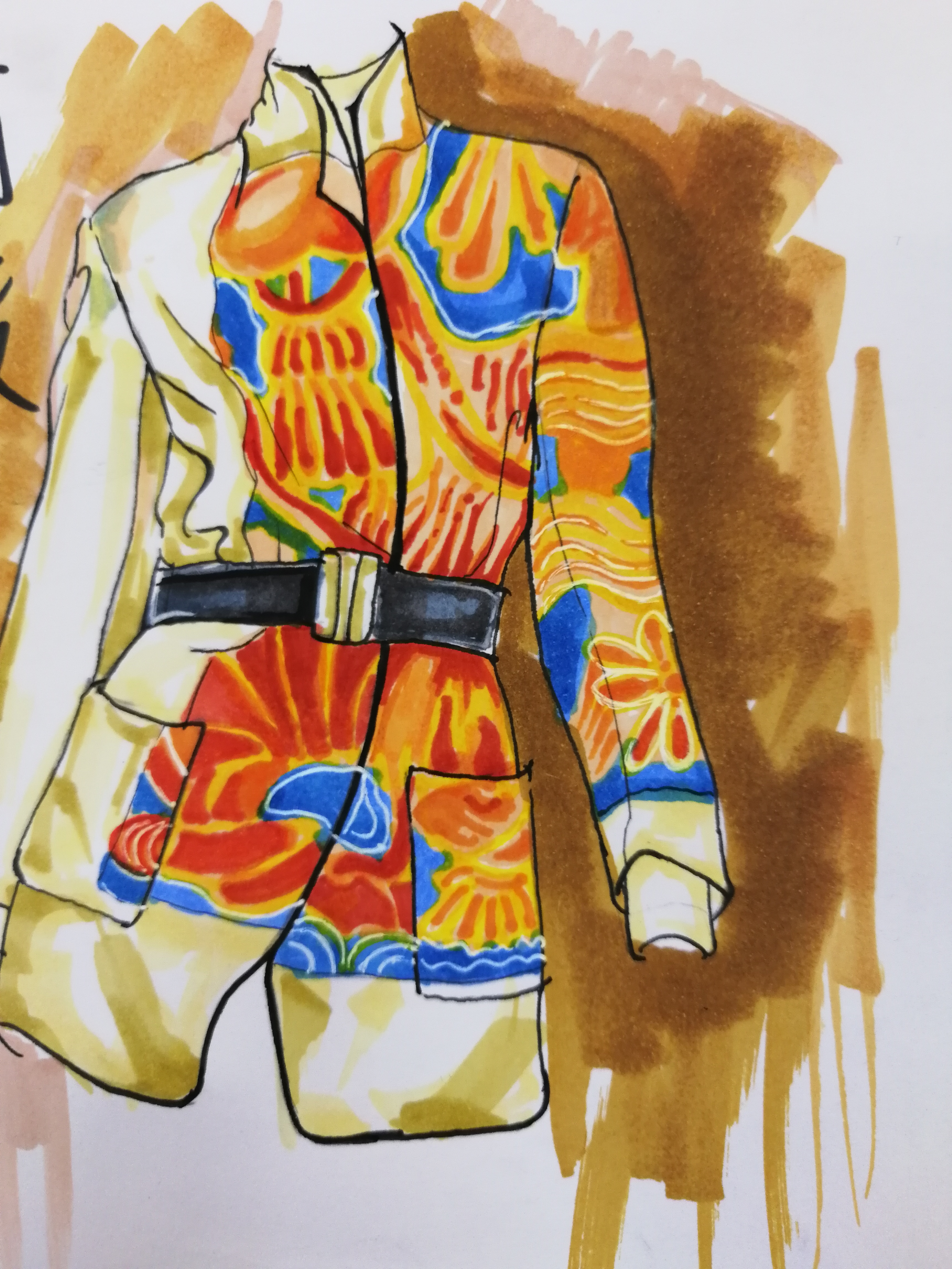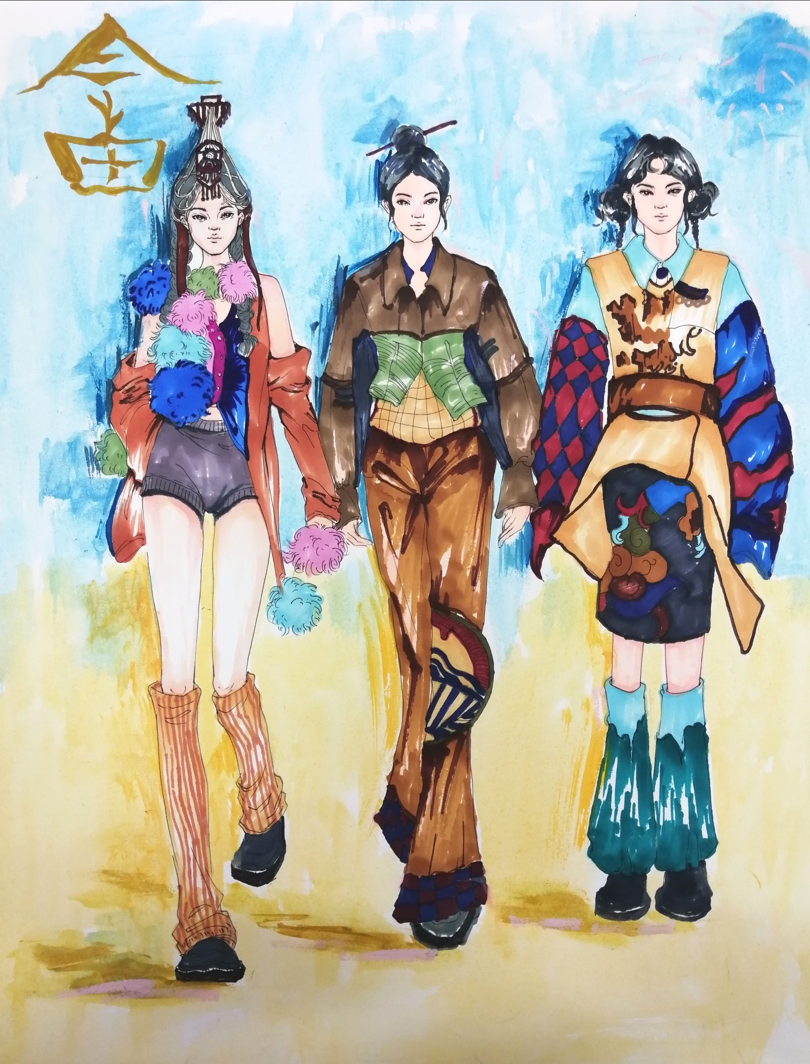 本次课程注重画面的整体性把握,鼓励学生以小组为单位,也可以个人为单位,其中,以参加服饰大赛要求为背景,设计具有系列感的时装画作品。相关作品是以大赛为背景的系列服装设计,包括相关配饰,整体性设计:头饰腰饰、腿套等,形式和色彩都有变化,但是都具有相同的元素,很有活力。