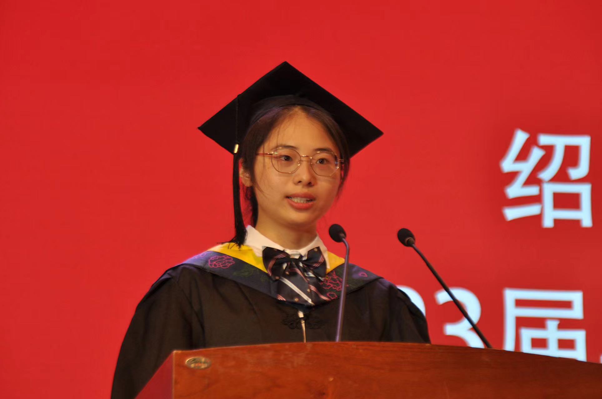 仪式第二个环节毕业生代表冯笑琳进行发言。浓浓离别意,深深母校情。她感慨大学四年的点滴生活,表达与老师同窗的恋恋不舍,期盼未来的再次遇见。