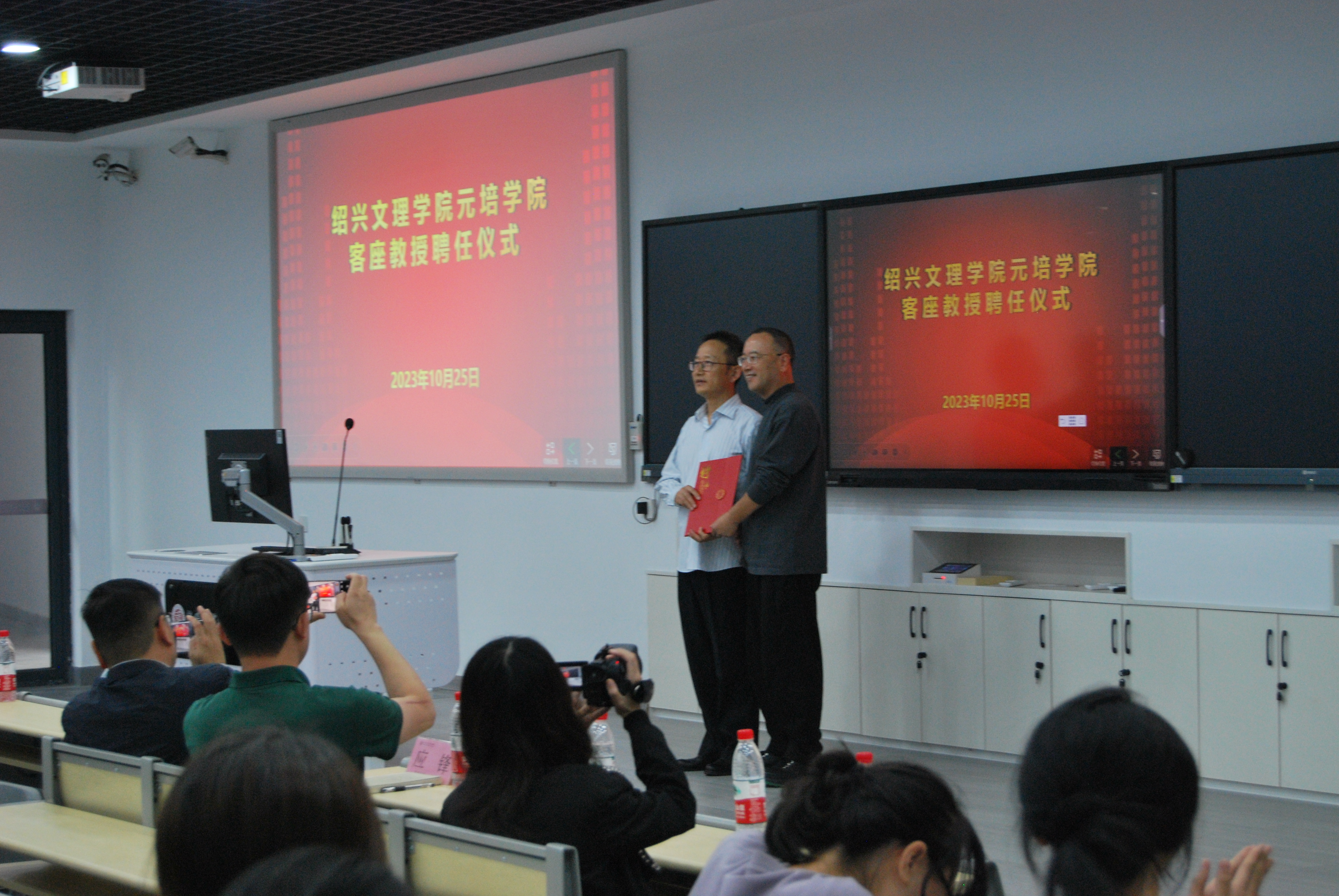 10月25日下午,学院在1号楼109举行客座教授聘任仪式,金德隆文化创意园董事长丁海土,学院院长沈红卫,绍兴市文化产业促进会副会长兼秘书长、绍兴市文化产业研究院院长应锋,金德隆文化创意园党支部副书记、招商部经理华立及分院师生出席活动,受聘仪式由分院党总支书记葛丛栩主持。