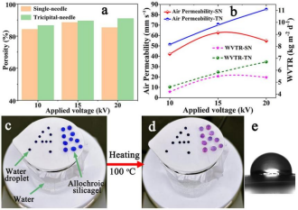 在此基础上,作者自行开发一种可改善电场分布的三叉针头式喷嘴,通过电场模拟和实验的方法深入探索由喷嘴装置诱导的电场分布对射流运动、纤维形貌及纤维集合体性能的影响,发现设计的新型喷嘴装置不仅能够增加纤维的产量,均匀的电场分布还赋予纤维膜优良的性能,如7 MPa的拉伸应力和401%的断裂伸长率,85.32 mm s-1的透气性,及良好的防水透湿性能(图2)。该研究通过喷嘴结构的设计改善了传统喷嘴极为不匀的电场分布,制备出更为均匀的纤维,提高了TPU纤维膜的机械性能及防水透湿透气性能。相关研究成果以“Effect of improved electric field distribution on jet motion, fiber morphology, and properties of electrospun thermoplastic polyurethane fibrous membrane”为题在中科院3区,影响因子3.1,国际期刊《Polymer for advanced technologies》发表。