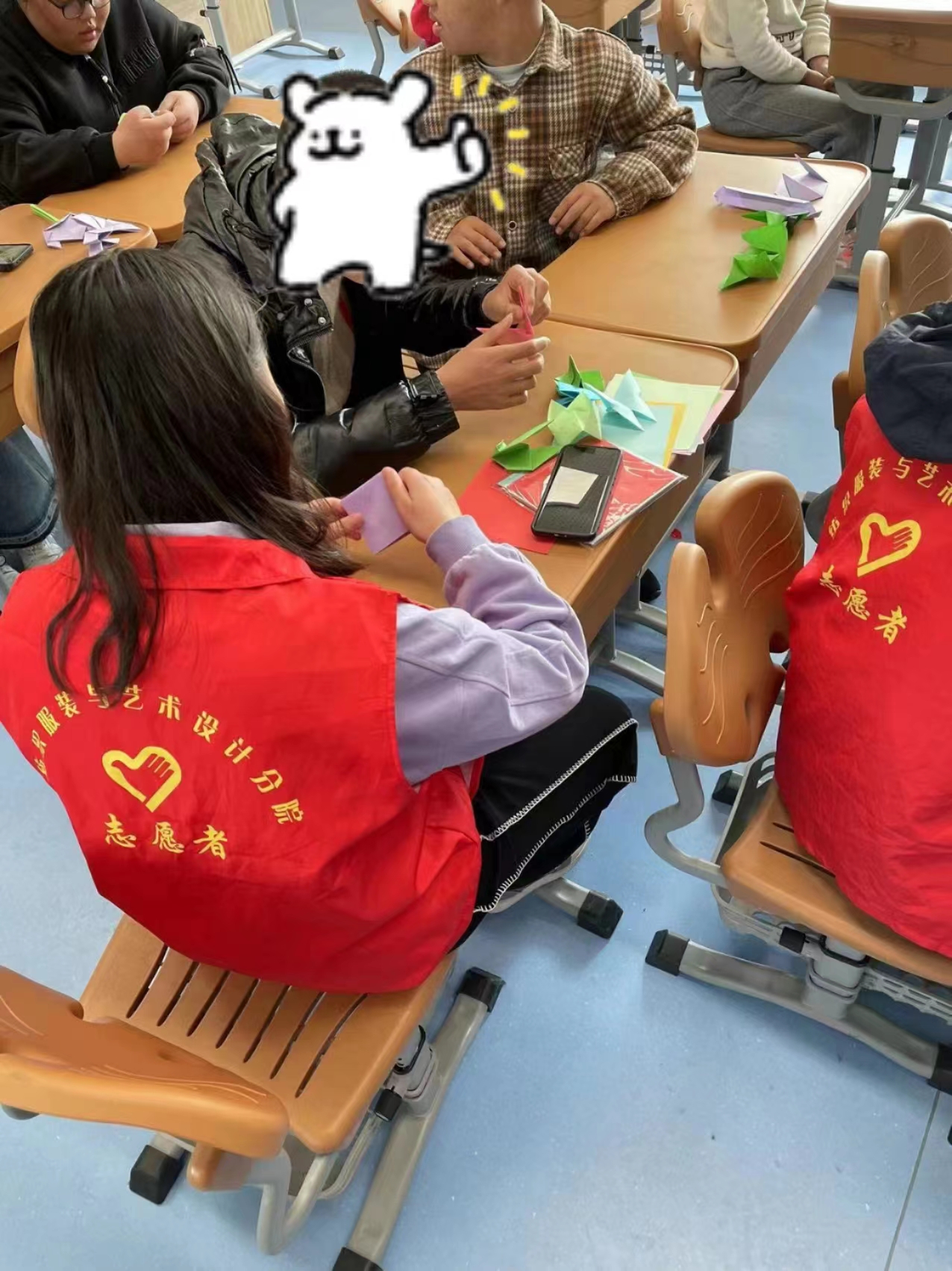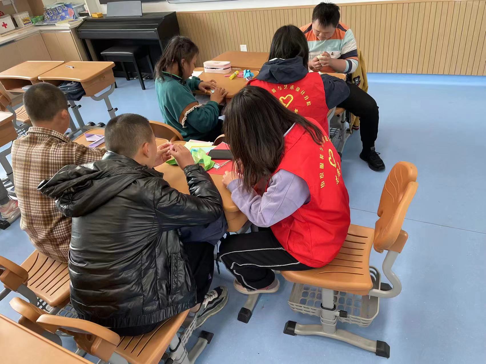 用太阳的光热去温暖孤独的世界,用爱心去传递我们的真切,用关怀去打开孩子的心扉。阳春三月,纺织服装与艺术设计分院“橙色阳光”志愿服务团队的党员志愿者们一如既往的利用专业优势为特殊学生开展创作、绘画、手工等美育培训,用色彩与孩子们进行交流,为他们传递自己五彩的世界。